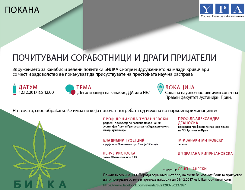 Здружението за канабис и зелени политики и Здружението на млади кривичари на 12 декември организираа научна расправа на тема „Легализација на канабисот – ДА или НЕ?“ на која ќе учествуваат адвокатот Јанаки Митровски, судијата Владимир Туфегџиќ, јавната обвинителка Ленче Ристоска, професорите Александра Деаноска, Драгана Кипријановска и Никола Тупанчевски. „На темата поканетите ќе ја посочат потребата од измена на наркоинкриминациите“, пишува во поканата.