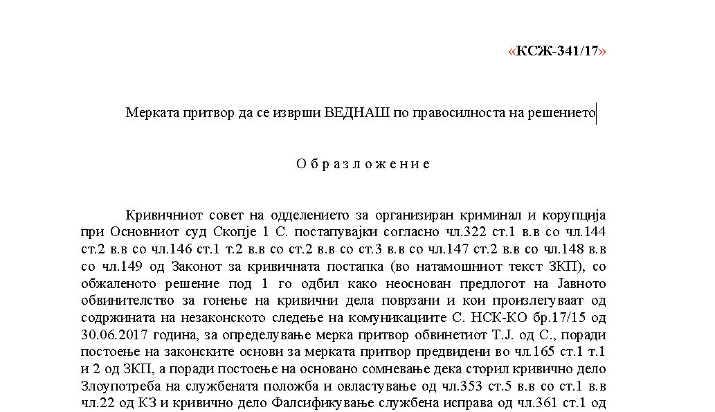 Законот за кривична постапка пропишува дека по одлуката на првостепениот суд, одлуката за притвор станува извршна и жалбата до Апелација не го одложува извршувањето, но не е пропишано што во ваков случај по поднесена жалба на одлуката на второстепениот суд. Дел од адвокатите се повикуваат на член 384 за суспензивно дејство на жалбата каде што пишува„ Ако во овој закон поинаку не е определено, со поднесувањето на жалбата на решението се одлага извршувањето на решението против кое е изјавена жалба“.
