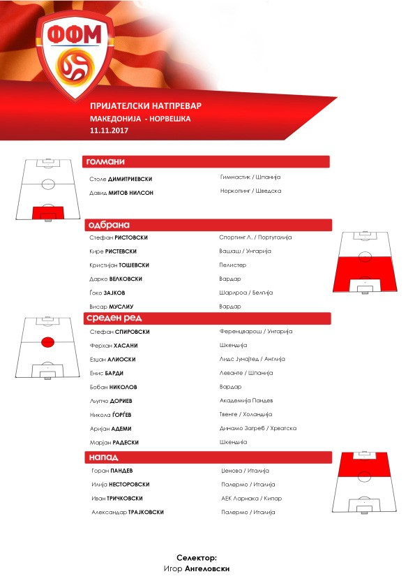 Селекторот на фудбалската репрезентација на Македонија, Игор Ангеловски, го објави списокот на фудбалери за пријателскиот натпревар со Норвешка, кој ќе се одигра на 11 ноември во Скопје. Селекторот за дуелот со Норвежаните ги повика истите играчи кои беа во конкуренција за последните две квалификациски средби, со Италија и со Лихтенштајн.