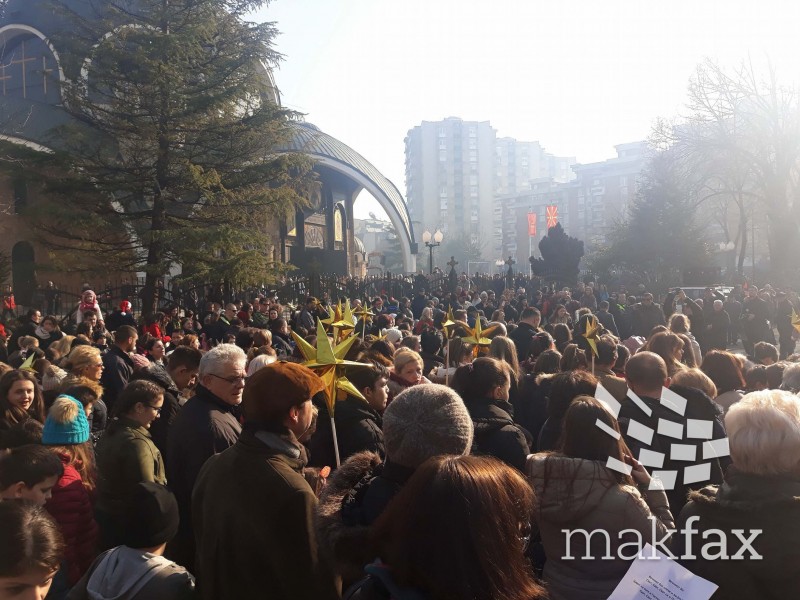 Стотици деца кои се дел од бадникарската поворка пристигнаа пред Соборниот храм во Скопје.