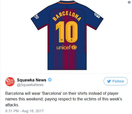 Фудбалерите на Барселона на своите дресови, на отворањето на Ла Лига, наместо презимињата ќе го носат името на градот, во знак на сеќавање на жртвите во терористичкиот напад кој се случи во четвртокот.