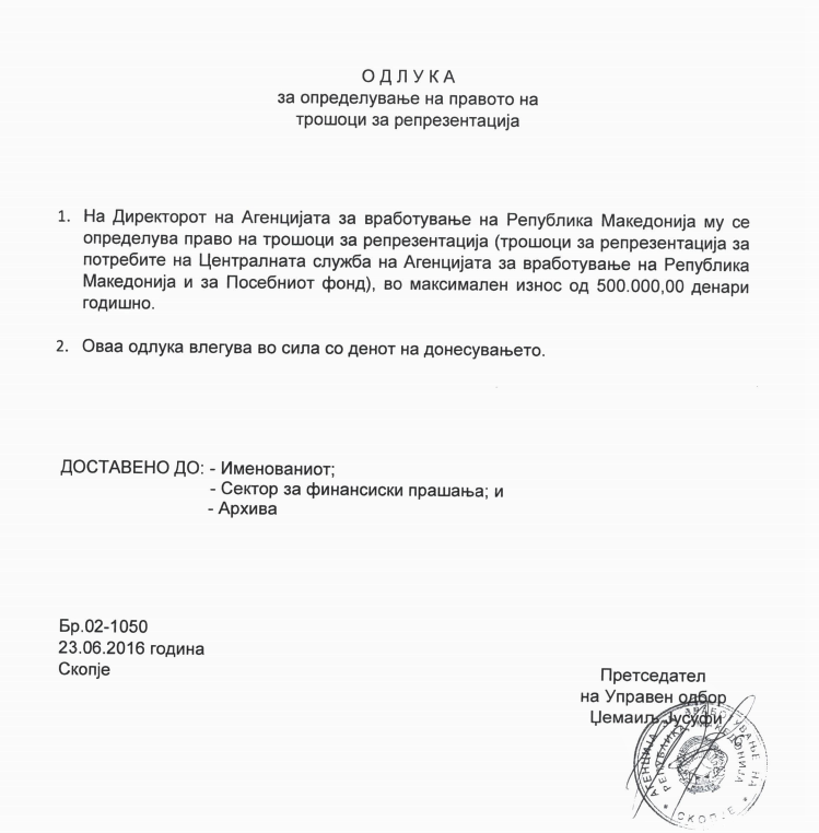 Управниот одбор на Агенцијата за вработување во 2013 донел две одлуки со кои определува право на трошоци за репрезентација за директорот и поранешниот заменик-директор за сума од 320 илјади денари, но не донел одлука за оваа намена за актуелниот заменик-директор. Ревизорите од увидот во деловодните книги утврдиле дека се исплатени 793 илјади денари повеќе од износот определен со одлуките.