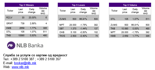 Скромна количина од само 45 акции на НЛБ Банка АД Скопје денеска се истргуваа преку класично тргување на Македонската берза. Просечната цена по која се реализираа овие трансакции изнесува 10.890 денари по акција, што претставува раст од 0.83% од постигнатата цена на вчерашното тргување.