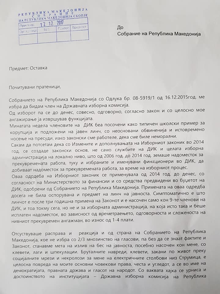 „Отсуствуваа расправа и реакција и од страна на Собранието на Република Македонија, кое нè избра со 2/3 мнозинство гласови, па без да се знаат фактите и законот станавме цел на излив на бес на јавноста, посебно насочен кон мене, со клевети, лаги и шпекулации“, наведува Бонева во оставката.