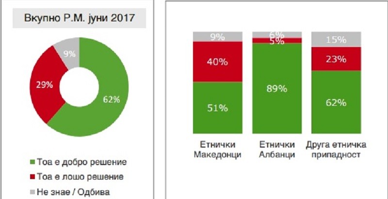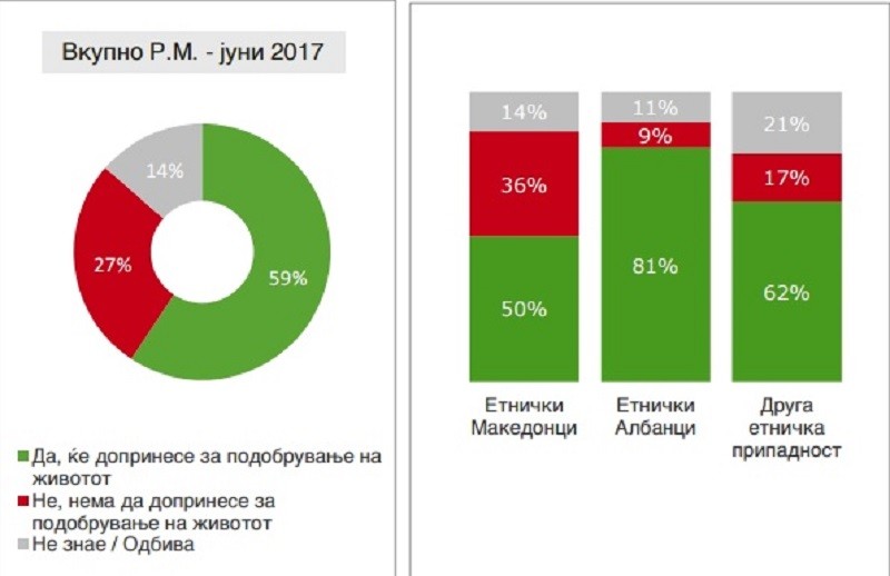 Во најголем број етничките Албанци очекуваат позитивни резултати од Владата, вкупно 73 отсто. Позитивните очекувања од Владата помеѓу граѓаните од другите етнички заедници изнесуваат 62% позитивни, 17% негативни. Најмалку распространета е поддршката помеѓу етничките Македонци 14%.