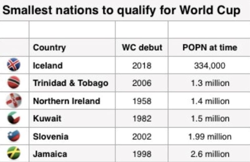 Државата, која има 334.000 жители, влегува и во мундијалската историја како земја со најмал број жители што играла на еден мундијал.