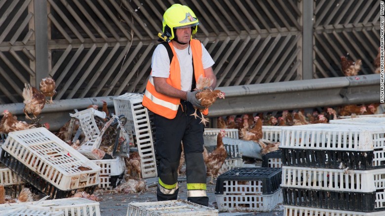 Околу 120 пожарникари, сепак, успеале да ги фатат кокошките и да ги вратат во камионот.