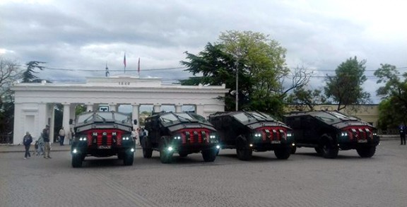 Во неколку градови на Крим се забележани оклопни теренци “Карател”, објавија корисници на социјалните мрежи. Војската им забранува на луѓето да се приближуваат до воените возилата, иако во Севастопол биле паркирани како за парада.