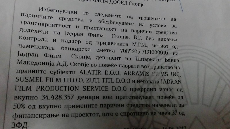 Што се однесува до „Јадран филм“, спротивно на член 37 од Законот за филмската дејност, иако имале обврска 65 отсто од доделените средства наменски да ги потрошат во Македонија, во три наврати извршиле откуп на девизни средства за износ од 34.428.357 денари и ги префрлиле на фирми во Хрватска и САД, како и на сметката на „Јадран филм“, „Продакшн сервис“ ДОО Загреб, кој е оновач на „Јадран филм“ ДООЕЛ Скопје.