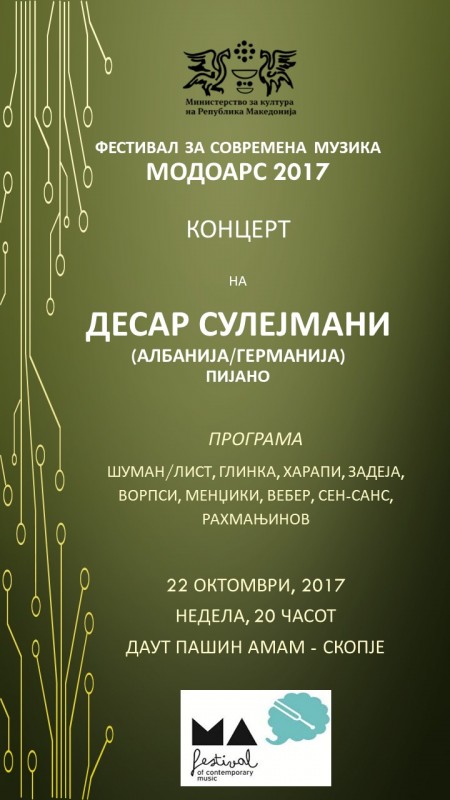 Во рамките на фестивалот за современа музика МОДОАРС 2017 година, концерт ќе одржи пијанистот Десар Сулејмани. Концертот ќе се одржи на 22 октомври во 20 часот во Националната галерија Даут Пашин Амам. Гостин на концертот ќе биде пијанистката Ема Попивода со која ќе настапат со дела од Шуман, Лист, Глинка, Харапи, Задеја, Ворпси, Менџики, Вебер и Рахмањинов.