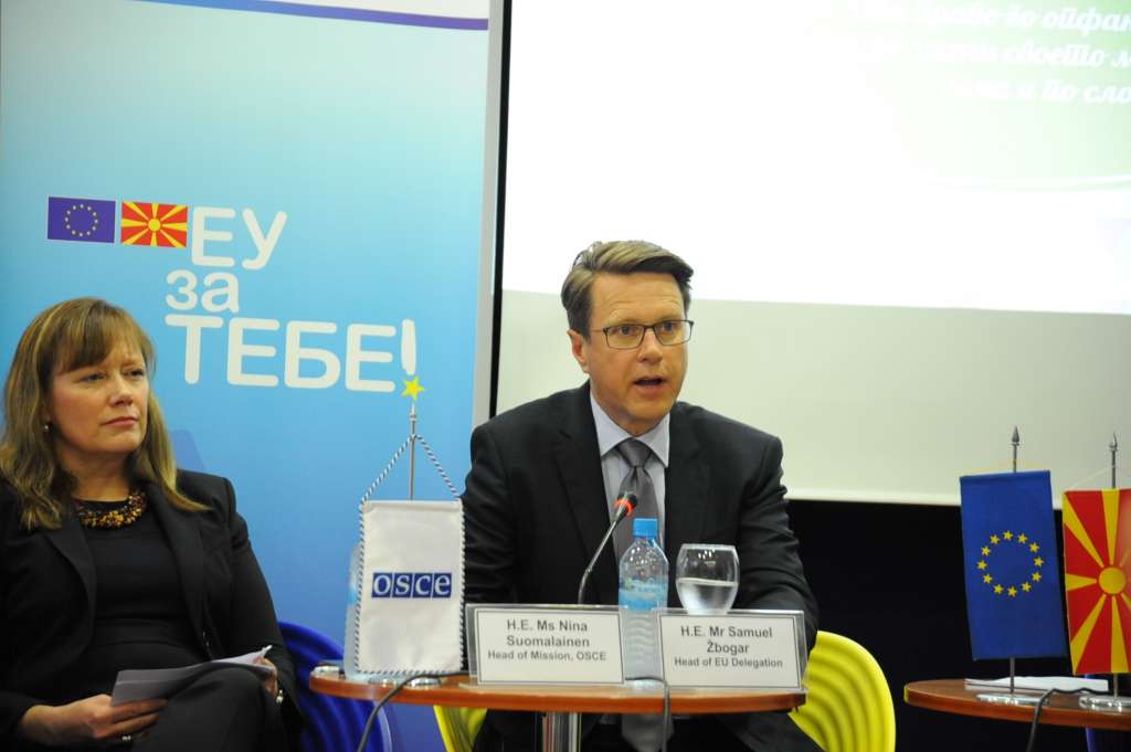На светскиот ден на слободата на медиумите, шефот на делегација на ЕУ Самуел Жбогар и шефицата на делегацијата на ОБСЕ, Нина Суомалаинен, остро го осудија нападот од минатиот четврток во парламентот на Република Македонија, кога беше извршен атак врз пратеници, новинари и политички службеници.