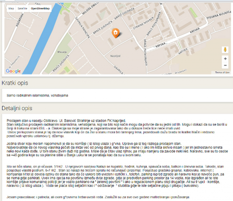 „Продавам стан во населбата Обилиќево, на улица Бановиќ Страхиња, недалеку од стадионот на ФК „Напредак“. Станот исклучиво им го продавам на радикални исламисти или вахабити, кои на кој било начин може да потврдат дека се членови на вакви организации. Како доказ може да послужи дека се бореле во Сирија и во Ирак на страната на Исламската држава. Дискрецијата од моја страна е гарантирана, така што во доказите нема да имаат увид трети лица. Услов при купувањето на станот е купецот да биде со потемен тен, да има подолга брада, да носи кратки панталони и редовно да оди во џамија“, се наведува во огласот објавен на интернет-страница наменета за огласување.