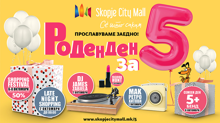 Скопје сити мол на 4 октомври слави пет години од своето постоење и по тој повод организира неколкудневна богата програма исполнета со добра забава и активности. Откако ги отвори своите врати пред 5 години, овој трговски центар направи вистинска револуција во шопинг искуството и се постави како регионален лидер меѓу трговските центри.