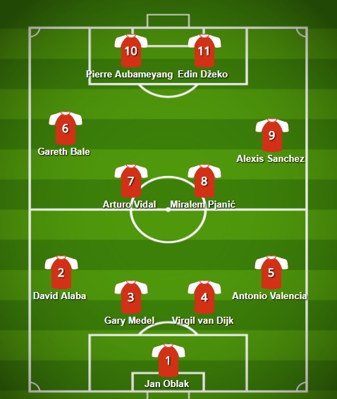 Среден ред: Герет Бејл (Велс/Реал Мадрид), Артуро Видал (Чиле/Баерн), Миралем Пјаниќ (Јувентус, БиХ). Алексис Санчез (Чиле/Арсенал)