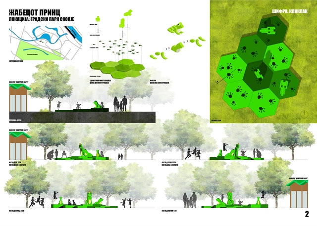 Просторна инсталација „Жабецот принц“ ќе биде поставена на дел од зелената паркова површина на просторот помеѓу Луна-паркот и кафулето „Централ парк“ во општина Карпош. Просторната инсталација „ Жабецот принц“ на композициски план треба да е составена од повеќе делови, и тоа:  Композиција од жаби (од кои едната е принцот), како и правилна геометриска структура која претставува асоцијација на листови. Инсталацијата претставува композиција од волумени изработени од челична ламарина  која ласерски се отсекува и потоа заварува до саканата форма, а потоа електростатски се бојадисува со трајни бои со што се остварува посакуваниот изглед. Подлогата ќе биде направена од излиен бетон во калапи од посакуваната форма. Бетонот треба да биде избоен со соодветна боја за бетон отпорна на атмосферски влијанија.