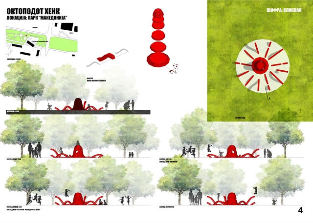 Просторната инсталација „Октоподот Хенк“ ќе биде поставена на дел од зелената парковска површина на потегот помеѓу Булеварот „Митрополит Теодосиј Гологанов“ и улицата „Јуриј Гагарин“ и  улицата „Братфордска“ во близина на националниот ресторант Македонска куќа  во општина Карпош.