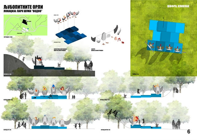 Просторна инсталација „Љубопитните орли“ ќе биде поставена на дел од  зелената паркова површина на просторот на Средно Водно помеѓу Хотел „Водно“ и  Жичницата  во општина Центар. Просторната инсталација „Љубопитните орли“ на композициски план треба да е составена од повеќе делови, и тоа:  композиција од 4 орли, како и правилна геометриска структура која претставува асоцијација на просторот – слично на трон на кој тие стојат. Инсталацијата претставува композиција од волумени изработени од челична ламарина  која треба да биде ласерски отсечена во саканата форма. Композицијата да биде составена од рамнини и волумени кои меѓусебно се заварени до заоблен профил за поголема безбедност. Подлогата ќе биде направена од излиен бетон во калапи од посакуваната форма. Бетонот треба да биде избоен со соодветна боја за бетон, отпорна на атмосферски влијанија.