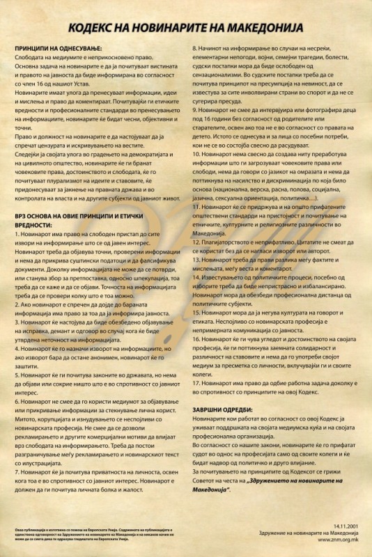 Кодексот на новинарите на Македонија беше изработен на шест јазици (македонски, албански, турски, влашки, ромски и англиски), а ќе биде доставен до сите медиуми соодветно на јазикот на кој работат.