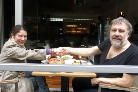Кречич потврдува дека потешко би успеала да го интервјуира со Џулиен Асанж, основачот на „Викиликс“, кој веќе четири години е во егзил во еквадорската амбасада во Лондон, без претходното познанство на Жижек со најпознатиот антиглобалистички хакер.