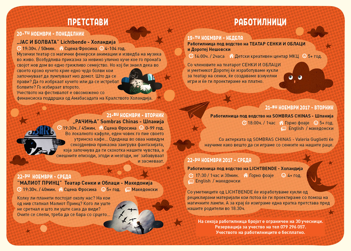 Фестивалот ќе биде затворен на 22 ноември со претставата „Малиот принц” во изведба на Театар „Сенки и облаци” од Скопје, кој минатата година прослави 10 години од своето постоење и континуирана продукција на театарски претстави на сенки. „Сенки и облаци” бележи бројни турнеи на неколку континенти и ја продолжува својата мисија на афирмација на макeдонските културни вредности преку театарски претстави со сенки.