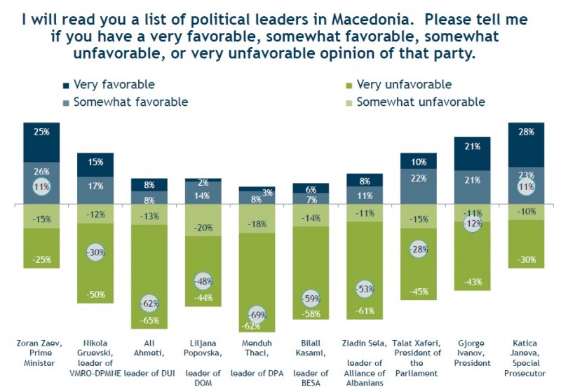 Специјалната обвинителка Катица Јанева предничи пред сите политички лидери, таа е поомилена и од Зоран Заев и од Никола Груевски, покажала најновата анкета на Меѓународниот републикански институт (ИРИ). Според анкетата 28% од граѓаните ја избрале Јанева како многу омилена, а премиерот Заев има 25%. Претседателот Ѓорге Иванов е многу омилен за 21 %, додека лидерот на ВМРО-ДПМНЕ Никола Груевски има 15%. 10% има претседателот на собранието Талат Џафери, а по него со 8 % следуваат Али Ахмети и Зијадин Села.