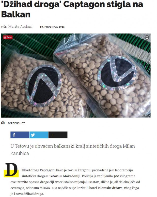 Дрогата Каптагон, којашто се нарекува и „џихад дрога“ била пронајдена во лабораторијата за синтетичка дрога во Тетово. Полицијата заплени 300 килограми од оваа опасна дрога, чии производители постојано го менуваат составот. Дрогата е слична, но многу посилна од екстазни, односно МДМА, а најмногу ја користеа борците на Исламска држава, поради тоа и се нарекува „џихад дрога“.