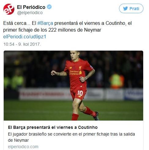 Бразилецот Фелипе Кутињо во петок официјално ќе биде преставен на „Камп Ноу“ како засилување на Барселона, објавија каталонските медиуми. Тие се убедени дека петок е денот Д бидејќи Барселона испратила покани за прес-конференција.
