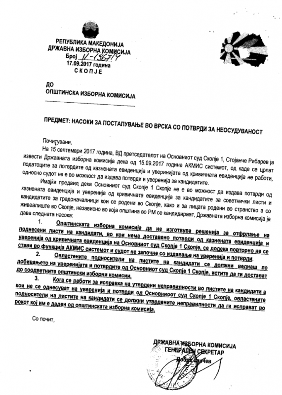 Претходно ДИК информира дека дала насоки до општинските изборни комисии да не изготвуваат решенија за отрфлање на кандидатурите кои немаат потврда од кривичната и казнената евиденција од скопскиот кривичен суд сè додека не проработи системот на Судот, а кога ќе се оспособи системот и ќе може да ги добијат потврдите за неосудуваност, кандидатите веднаш да ги достават до надлежната ОИК.