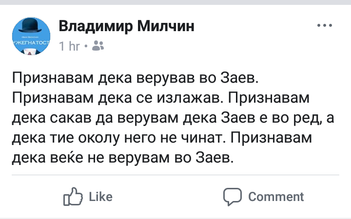 Владимир Милчин на неговиот Фејсбук профил напиша дека се излажал и дека веќе не верува во премиерот Зоран Заев.