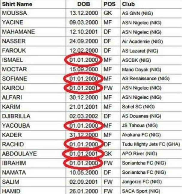 Дури седуммина фудбалери играчи на Нигер се родени на 1.јануари 2000 или 1.јануари 2001 година. Овој податок веднаш предизвика реакција на спортската јавност.
