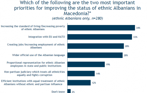 Зголемувањето на животниот стандард и намалувањето на сиромаштијата резултираат како прв приоритет кај етничките Албанци (34 отсто) стои во најновата анкета спроведена во март годинава, од страна на Меѓународниот републикански институт – ИРИ. Интеграцијата во ЕУ и НАТО се втор приоритет, со 33 отсто, додека отворањето нови работни места е на третото место, со 28 отсто. Пошироката официјална употреба на албанскиот јазик е на четворто место со околу 28 отсто, додека потоа следуваат правичната застапеност во институциите (19 отсто), департизација на судството за еднаков третман на сите (14 отсто), ефикасни и праведни институции (12 отсто), додека 2 отсто не одговориле.