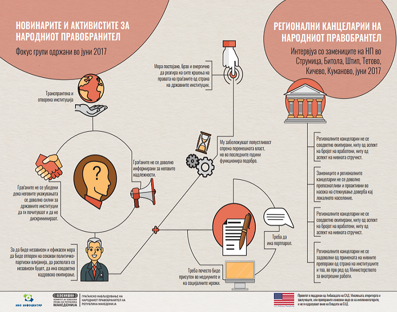 Граѓанските здуженија континуирано ја набљудуваат работата на Народниот правобранител, а главниот фокус на набљудувањето беше функционирањето на регионалните канцеларии на Народниот правобранител во Струмица, Битола, Штип, Куманово, Кичево и Тетово, како и перцепцијата на новинарите и граѓанските активисти за степенот на отвореност, достапност и ефикасност на оваа институција.