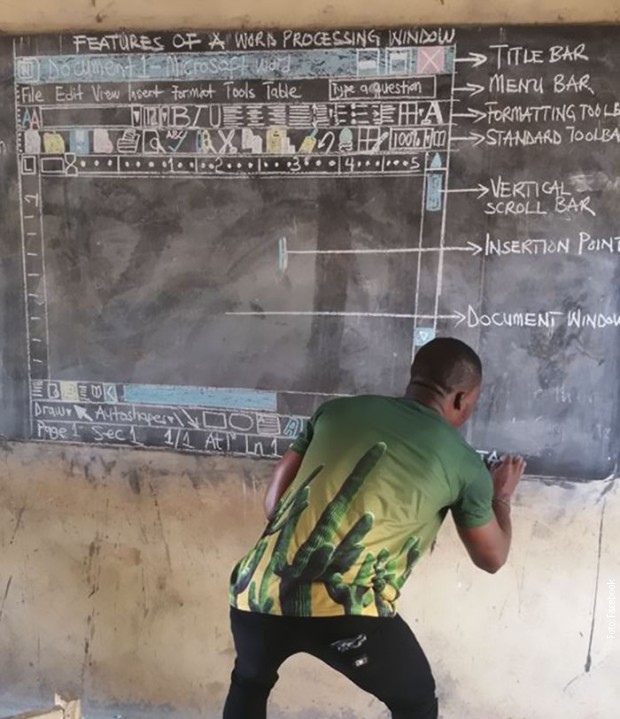 Голем број луѓе низ светот се воодушевени од постапката на наставник од Гана кој предава информатика без компјутер, така што на учениците на табла им црта изглед на програмски прозор и објаснува што прави секоја од функциите.