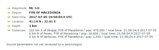 Земјотрес со јачина од 3 степени според Рихтеровата скала бил почувствуван во 21 и 58 часот во Охрид.
