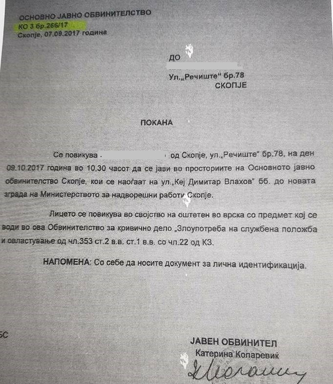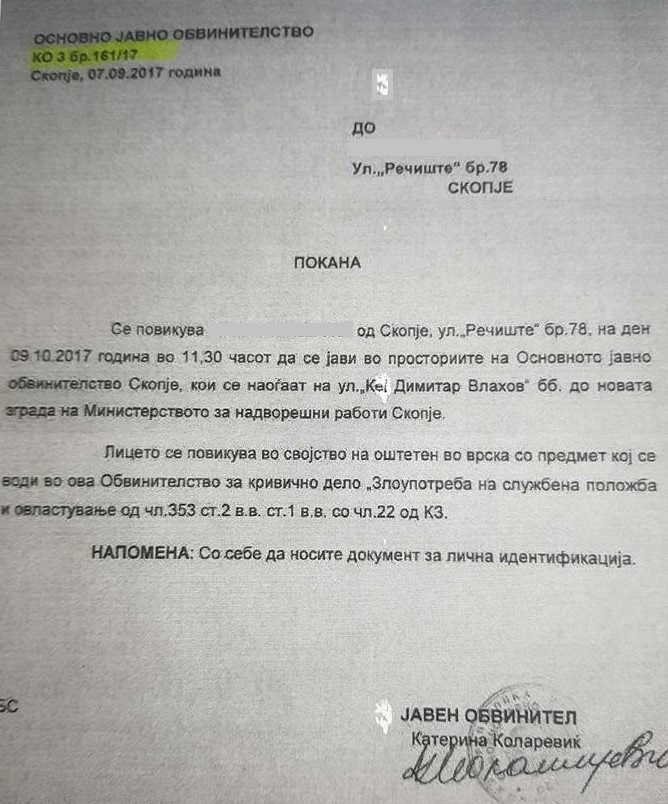 Пет покани за различни предмети во ист ден, на секој половина час, испратила обвинителката Катерина Колариќ до оштетен во разни предмети. Според документите, оштетениот треба да се појави во ист ден во обвинителството во 10.30, во 11 часот, во 11.30, во 12 часот и во 12.30. Здружението „Зелена лупа“ на објавата напиша дека обвинителката е позната како обвинител што малтретира граѓани во судови без докази. Од ова здружение напишаа: „Надвор од сите професионални норми пуштила 5 покани за различни предмети, без да земе предвид дека за секое рочиште се потребни денови за подготовка на одбрана“. Оттаму најавуваат пријава за обвинителката до Советот на јавниТЕ обвинители.