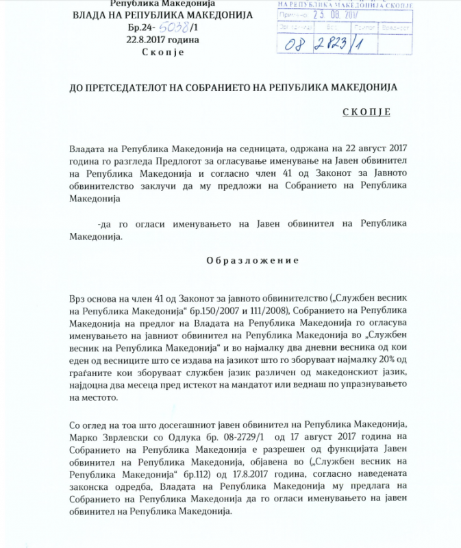 Огласот за именување нов јавен обвинител ќе се најде на собраниската седница закажана за 4 септември. На седницата како последна точка е ставен предлогот за именување огласување јавен обвинител на РМ, што Владата вчера го достави до Собранието. Во предлогот на Владата се наведува дека со оглед на тоа што досегашниот јавен обвинител на РМ, Марко Зврлевски, со одлука од 17.8.2917 на Собранието на РМ, е разрешен од функцијата јавен обвинител на РМ, во согласност со наведената законска обврска Владата на РМ му предлага на Собранието на РМ да го огласи именувањето јавен обвинител на Република Македонија.