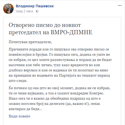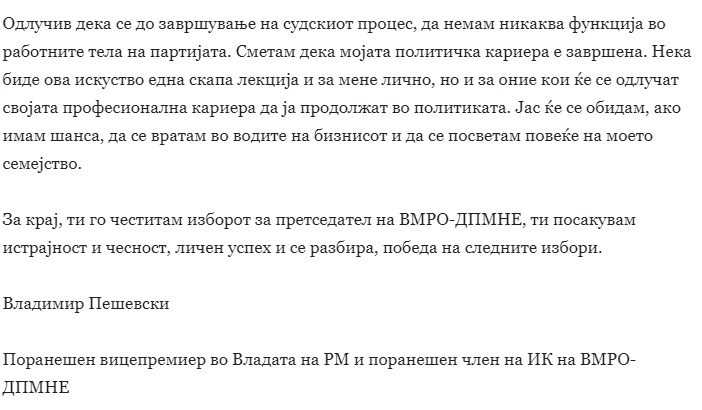 „Сметам дека мојата политичка кариера е завршена. Ова искуство нека биде една скапа лекција и за мене лично, но и за оние што ќе се одлучат својата професионална кариера да ја продолжат во политиката. Јас ќе се обидам, ако имам шанса, да се вратам во водите на бизнисот и да се посветам повеќе на моето семејство“, истакнува, меѓу другото, Пешевски, во подолгата објава, која е со наслов „Отворено писмо до новиот претседател на ВМРО-ДПМНЕ“.