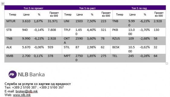 Акцијата на НЛБ Банка АД Скопје беше истргувана во количина од 293 истргувани акции по просечна цена од 9.994 денари, со што се позиционираше на трето место по промет. Акцијата забележа пад од 6,23%.