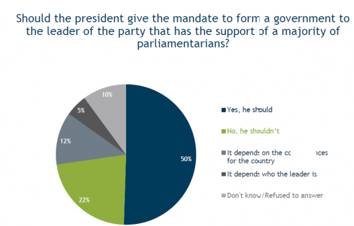 На прашањето дали претседателот на државата треба да го додели мандатот на лидер на партија кој има обезбедено мнозинство во Собранието, 50 отсто одговориле со „да“, 22 отсто со „не“, 12 отсто се изјасниле дека тоа зависи од последиците по државата, 5 проценти одговориле дека зависи за кој лидер станува збор, додека 10 отсто одбиле да одговорат.