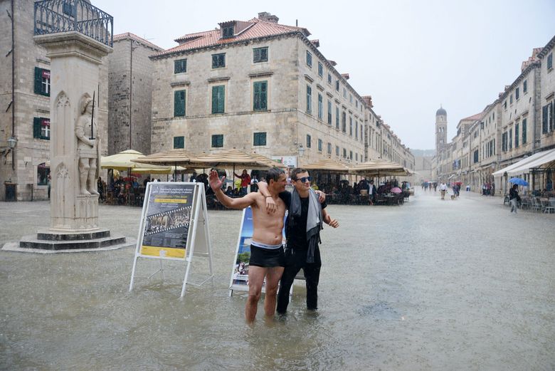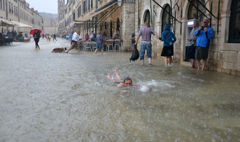 Тој се соблече и заплива на главната улица Страдун, која поради обилните врнежи се претвори во вистински базен.