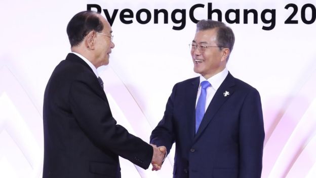 Домаќин на вечерата беше јужнокорејскиот претседател Мун Жае-ин непосредно пред отворањето на Зимските олимписки игри. Тој се ракуваше со севернокорејскиот церемонијален лидер, Ким Џонг-нам, кој заедно со сестрата на севернокорејскиот лидер Ким Џонг Ун, Ким Џо-јонг присуствуваат на церемонијата во Пјонгчанг. Ким Џо-јонг е прв член од севернокорејското лидерско семејство кој ја посетил Јужна Кореја од Корејската војна од 1950-1953 година.