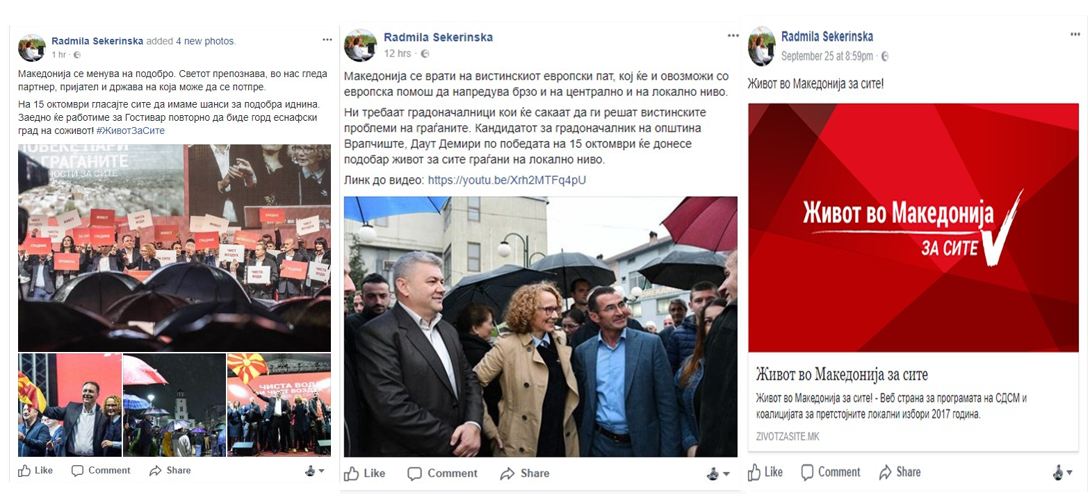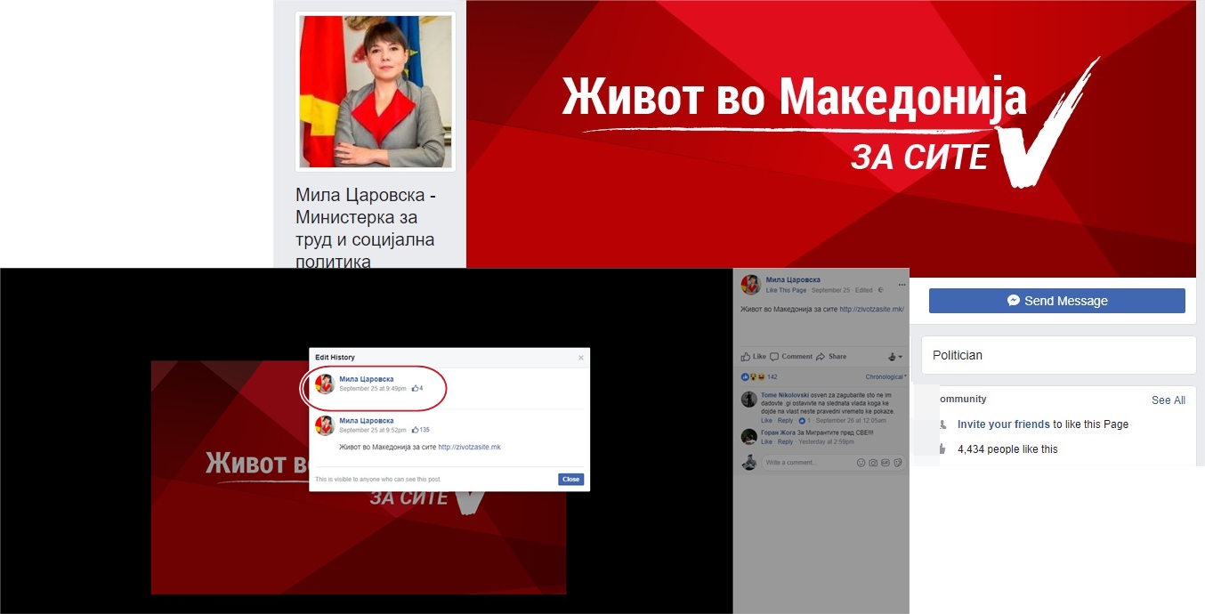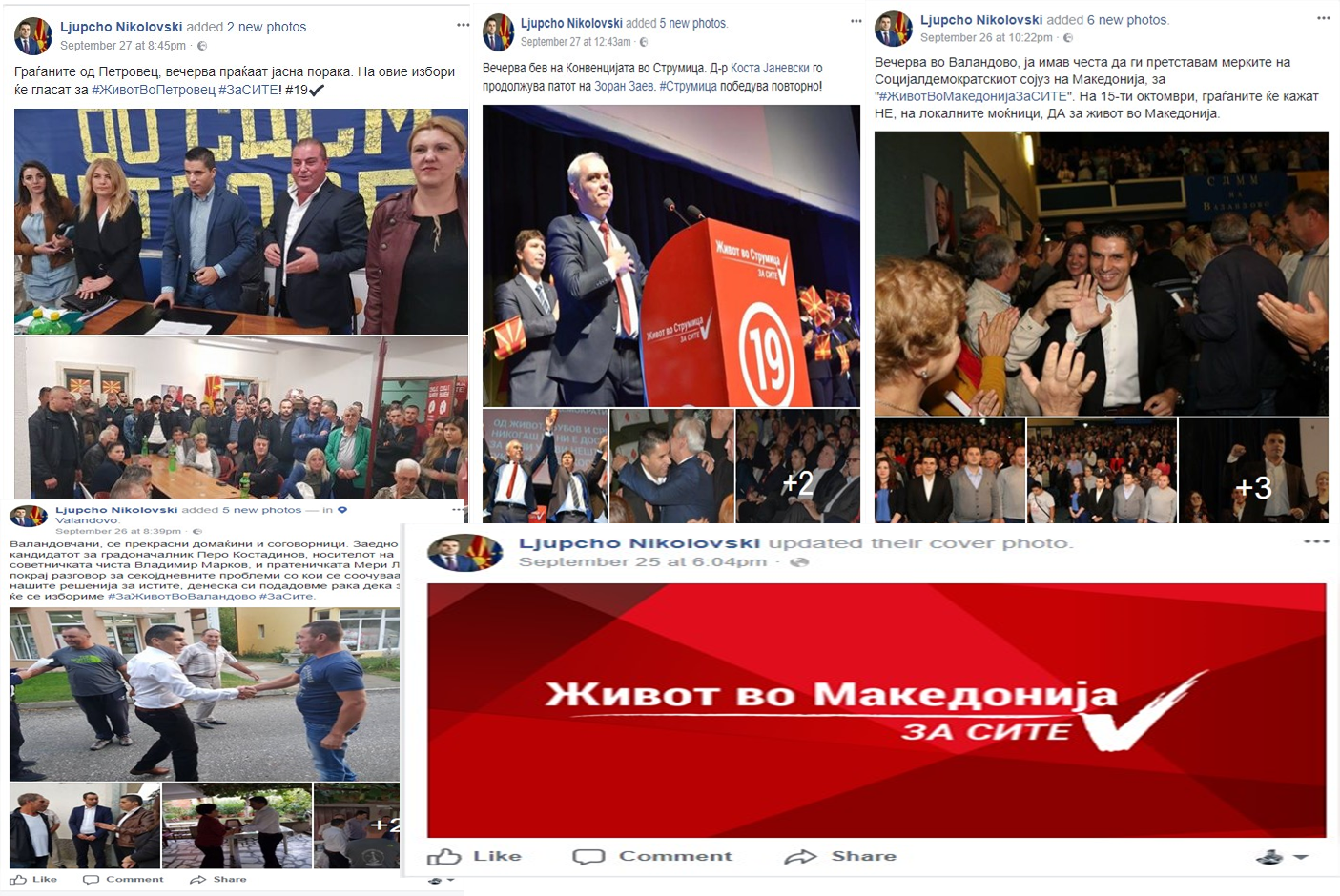 Фотографијата на фејсбук-страницата на Царовска е објавена на 25 септември (понеделник) во 21.49 минути. Покрај Царовска, министерот за земјоделство, шумарство и водостопанство, Љупчо Николовски, социјалните мрежи ги користи за промовирање на новите партиски штабови што партијата ги отвора во Македонија, но и за пренесување на пораката на граѓаните дека тие ќе гласале за „Живот во Македонија“. Доколку прегледате што друго има објавувано Николовски, ќе забележите дека тој на 26 септември (вторник) бил на партиска средба со граѓани во Валандово, заедно со кандидатот за градоначалник Перо Костадинов, а фотографиите на неговата страница на „Фејсбук“ се објавени во 20 часот.