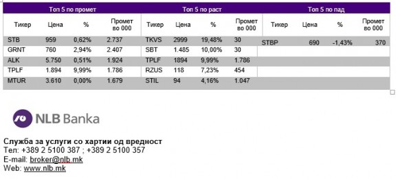 Кај акциите во класично тргување најмногу се тргуваше со Стопанска Банка АД при што се реализираа 2.875 акции по просечна цена од 952,03 и вкупна вредност од 2,7 милиони денари.