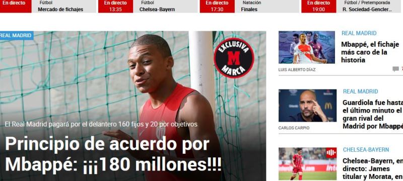 Весникот „Марка“ секогаш е веродостоен извор кога се во прашање информациите поврзани со Реал. На својата интернет-страница објави дека „кралскиот клуб“ на Монако ќе му плати сума помеѓу 150 и 160 милиони евра, а остатокот ќе зависи од настапите на Мбапе во дресот на Реал.