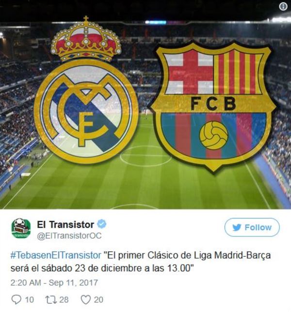 Првото овосезонско Ел Класико помеѓу Реал и Барселона нема да се одигра на 20 декември, како што првично беше планирано, туку на програмата ќе биде три дена подоцна, викендот кога католиците го слават Божиќ.