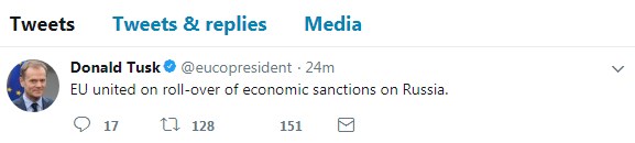 „Европската Унија се согласи да продолжи со економските санкции против Русија“, објави полскиот политичар на социјалната мрежа „Твитер“.