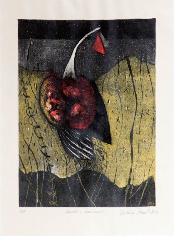 Делата на Ахмети, како графиката така и комбинираната техника на платно, некои меѓународно афирмирани, а други нови тукушто појавени на сцената, се однесуваат на реорганизирање на доживувањата на реалноста, на различниот пристап при примената на сликите, а со тоа и на редизајнирање на светот на видливото, смисленото и можноста. Се говори и за убавината на индивидуалното уметничко дело, но уште повеќе за традицијата, луѓето, нивните социјални врски, нивните очекувања и копнежи. Како претставник на новата генерација на графичката уметност, секогаш активен во изложбите како од локален така и од меѓународен карактер, делата на Бурхан Ахмети се карактеризираат со изворна афирмација на сложените графички техники (сува игла, акватинта, линорез, литографија, дрворез, бакрорез, монотипии, па сè до дигиталната графичка дисциплина), како и со нагласена интелектуалност во пристапот кон визуелната уметност.