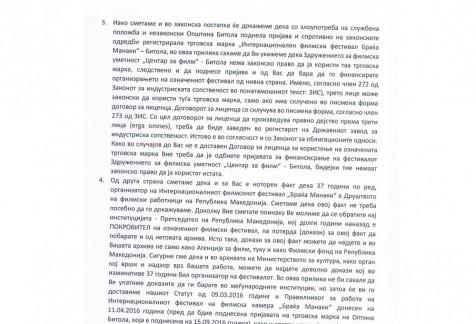 „Неспорен е фактот за досегашното долгогодишно организирање на фестивалот ИФФК ‘Браќа Манаки’ од страна на ДФРМ, чиј постојан партнер е Општина Битола. Согласно конкурсот, апликантите ја имаат доставено потребната документација, но Агенцијата за филм не смее да го занемари фактот дека постои и решение од Државниот завод за индустриска сопственост на правото на трговска марка – ИФФК Браќа Манаки – Битола“.