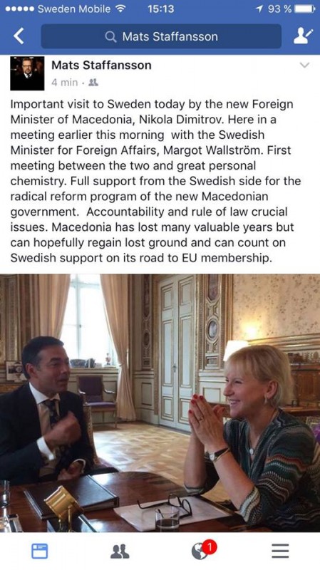 „Важна посета на Шведска од новиот македонски министер за надворешни работи, Никола Димитров. Утринава имаше прва средба со шведската министерка за надворешни работи Маргот Валстром. Прва средба и извонредна меѓусебна хемија. Целосна поддршка од Шведска за програмата со радикални реформи на новата македонска Влада. Одговорноста и владеењето на правото се главната задача. Македонија потроши многу години, но, се надевам, може да го надополни изгубеното и може да смета на шведската поддршка на патот кон членство во ЕУ“, напиша амбасадорот Стафансон.