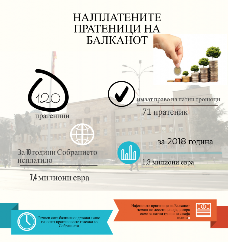 Речиси сите балкански држави скапо ги чинат пратеничките гласови во Собранието. Иако собраниските сали често се полупразни, пред благајните секогаш има долг ред кога треба да се исплаќаат патните трошоци за пратениците. Ова воопшто не е чудно ако се има предвид дека најскапите пратеници на Балканот земаат по десетици илјади евра само за патни трошоци секоја година. Хотелски сместувања, скапи патувања во странство, авионски карти, намирени трошоци за јавниот превоз, се само дел од привилегиите што ги имаат најплатените балкански пратеници.